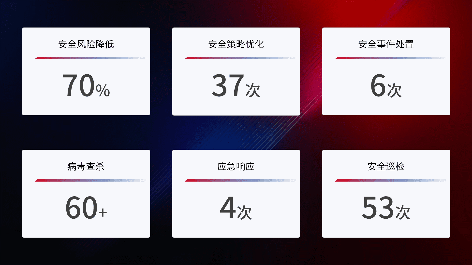 提供全面的安全事件报告体系,,,包括处置报告、、周报、、、季度和年度总结,,,,结合持续监控,,,帮助客户深入了解网络安全状况。。。。